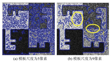 图 2(a)、2(b)是边缘长度最小阈值为5像素、模板大小分别采用了5像素和9像素所得到的边缘叠加图。可以看出图 2(a)、2(b)中的边缘定位均较为准确,符合本文要求。另外也可以看到,与使用简单阈值的算法相比,虽然采用置信度传递策略具有更好的边缘连续性,但是边缘断裂现象不可避免地还是出现在图 2(b)中的A处。伪边缘的问题通过增大模板尺度能够得到一定程度的改善,但并不能彻底解决,如图 2(b)中B处依然存在伪边缘的现象。所以,EDISON边缘算法依然存在虚警和边缘不连续问题,在区域生长算法中,边缘虚警会导致区域过分割问题,边缘不连续则会导致欠分割问题,即不同的区域在区域生长时成为同一个区域。但是eFNEA算法受这两个问题影响较小,这主要是因为虽然边缘约束初始小尺度下的区域生长与合并过程,但并不等价于仅受到边缘约束,其过程还受到形状因子的影响。eFNEA分割算法可以允许边缘提取结果存在不连续性及大量虚假边缘,大量虚假边缘会随着后续区域生长与合并过程而消失,边缘不连续性也会因加入了形状因子的eFNEA分割算法得到改善。因此,eFNEA小尺度分割过程通过结合EDISON边缘检测算法和FNEA算法,将像素局部梯度、上下文信息等额外信息融入在内,理论上分割效果更好。后续实验涉及到eFNEA分割,如果没有另外指定参数,默认采用的参数组合如下:模板尺度为9像素,最小边缘长度为5,置信度边界分别为为0.4像素、0.7像素。