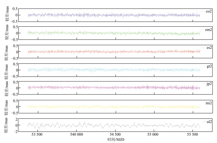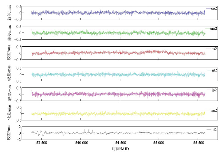 图 1、图 2给出了7个分析中心结果与IERS C04结果的比较。可以看出,各个分析中心估计的ERP结果与IERS C04发布的相应历元ERP结果有一定差异,其中co2、em2、es2、gt2、jp2、mi2分析中心估计的结果从整体上看差别不大,但ul2与其他分析中心的结果间存在明显差异,在极移X、Y方向其最大值分别为1.23 mas、1.25 mas,最小值分别为-0.97 mas、-1.08 mas,而其他分析中心的结果最小值和最大值均在0.3 mas以内。这种差异产生可能主要是由于不同分析中心采用了不同的数据处理软件、不同的数据处理策略造成的。