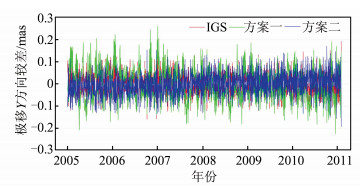 | 图 4 不同方案结果与IERS C04结果的差值(极移Y分量) Fig. 4 Polar Y Differences Between IERS C04 and Results from Different Schemes |