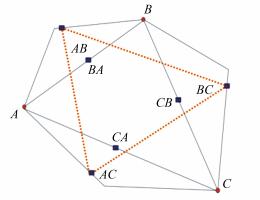 上述寻址区域主要是由特征点构成。由于城市环线的特点,在两点间的路线导航时,现有导航软件通常优先选择环线再利用环线间的放射线到达目的地。本文通过多种方案对比,选择用户之间行车路线的中点来构成位置推荐的多边形区域。这种方式可以保证区域边界的可到达性,而区域内的道路网确保活动地点的可到达性;用户间的行车路线采用花费时间最少的路线,有利于平衡各用户到达推荐位置所需的时间成本。如图 2所示,A、B、C代表 3个用户,AB、BA分别代表A到B、B到A导航路线的中间点, 其他同理,虚线围成区域为位置推荐区域。对于用户A来说,进入位置推荐区域总有A-AB、A-AC两条路线;同理,对于主体B和C来说, 也各自有B-BA、B-BC和C-CA、C-CB两条路线。在实际的路网中,进入位置推荐区域的路径可能还会更多。