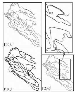为了检验算法在等深线集化简中的应用效果,本文对1:4万海图上的部分等深线数据进行了化简实验。图 9为1:8万和1:20万的化简结果,放大图与目标比例尺下的实际尺寸相同。从图 9中可以看出,等深线的主要弯曲特征都能够清晰地表达,曲线形态较为光滑,而且没有自交的拓扑错误发生,有效地保持了海底地形的主要特征。