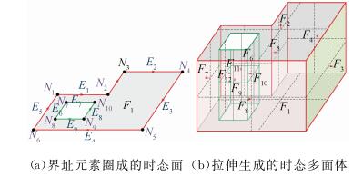 2) 若公共时态面上的时态边除该时态面外还被其他两个时态面共用,分为两种情况:一种是两时态面共面,则注销该时态边,如图 5(b)中的e3;另一种是两时态面不共面,保留该时态边,如图 5(b)中的e1。若公共时态面上的时态边除该时态面外还被其他3个或3个以上时态面共用,则该时态边不能被注销。