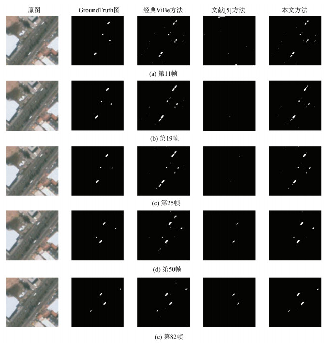 SkySat-2数据是SkySat拍摄的拉斯维加斯市区的路况信息,检测结果如图 9所示。图 9中从左到右每列依次为原图、GroundTruth图、经典ViBe方法、文献[5]方法和本文方法。可以看到,经典ViBe方法和本文方法的检测率较高,几乎无目标漏检。而文献[5]只能检测出少量稍大的目标;在检测精度方面,前9帧的视差伪运动不明显,但是“鬼影”现象严重。从第10帧开始(图 9(b)),本文方法针对视差和“鬼影”两种伪运动进行处理,虚警得到抑制。到20帧(图 9(c))左右,“鬼影”误检测的消除几乎完成,而视差的误检测也有很好的消除效果。在31帧时(图 9(d)),视差误检测像素数控制在极低水平。在550帧之前,本文方法检测效果稳定、良好;而经典方法的“鬼影”和视差误检测较严重。从550帧开始(图 9(f)),卫星飞过高楼顶,获取高楼的另一侧影像信息。同样地,整体背景局部变化较大,经典方法的误检依旧较多;而本文方法可适应这种背景局部变化,检测效果依然良好,误检测数低。文献[5]在整段视频中的视差伪运动屏蔽效果佳,几乎无误检测。