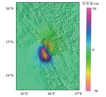 图 7中,箭头表示东西向和南北向矢量的叠加,即水平形变场,定义北方向和东方向为正。垂直向的形变分量结果表明,地震导致左右两盘形变区域,左盘表现为上升形变特征,得到的垂直向最大隆升形变约为78.8 cm;右盘表现为沉降形变特征,垂直向的最大沉降量约31.4 cm;左盘隆升形变量远大于右盘沉降形变量。通过结合东西向和南北向形变场与垂直向形变场的结果,可以发现,发震断层面为自西北向东南延伸的倾斜面,发震断层为倾斜的逆冲断裂,兼具右旋特性。