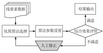 在线要素化简过程中,化简算法的选择以及参数设置往往高度依赖于人工反复修正,其主要过程包括算法选择、参数设置和人工修正3个步骤,如图 1所示。各化简算法所产生的化简效果不尽相同,导致在算法的选择上需要反复比较。例如,Douglas‑Peucker(D‑P)算法在化简阈值较大时易产生锯齿;Li‑Openshaw算法光滑效果十分明显,但对于原有内点的位置精度改变较大;基于弯曲组的线要素化简算法对曲线的基本形态特征保持较好,但不同化简阈值之间的化简效果跳跃性较大[1-3]。为了适应多样化制图的需求,制图员需根据具体情况不断地进行算法和参数的调整,以达到预期的化简效果。