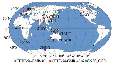 | 图 2 17个iGMAS观测站分布图 Fig. 2 Distribution of 17 Selected Stations from iGMAS |
