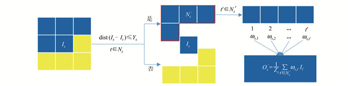 | ${Z_s} = \sum\limits_{t \in N{'_s}} {{G_{\delta \alpha }}(\left\| {s - t'} \right\|){G_{{\delta _\gamma }}}(\left\| {{I_s} - {I_{t'}}} \right\|)}$ | (10) |