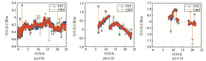 以2017年年积日(day of year,DOY)第352天的分区综合改正数拟合结果为例,分别选取一颗GEO、IGSO和MEO卫星为代表,分区综合改正数拟合结果如图 3所示。图 3中ORI(original)表示原始分区改正数,FIT(fitting)表示拟合出的改正数。