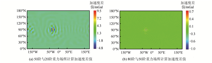 为量化阶次对加速度产生的影响,本文比较了50阶次和20阶次重力场的加速度差值及80阶次和50阶次重力场的加速度差值(图 5)。火卫一外部14 km球面上的加速度在1~136 mGal间变化,通过图 5发现,50阶和20阶之间,80阶和50阶之间的差异最高分别达到9.55 mGal和0.96 mGal。且在(1°N, 49°W)附近出现最大差值,陨石坑附近加速度差值变化也较为明显。Stickney陨石坑所处位置地形变化较为剧烈,对加速度的影响较大。由图 5还发现,50阶和20阶重力场加速度差值相较80阶和50阶重力场加速度差值更为明显。这一结果表明火卫一高阶次重力场仍会产生显著的重力加速度。